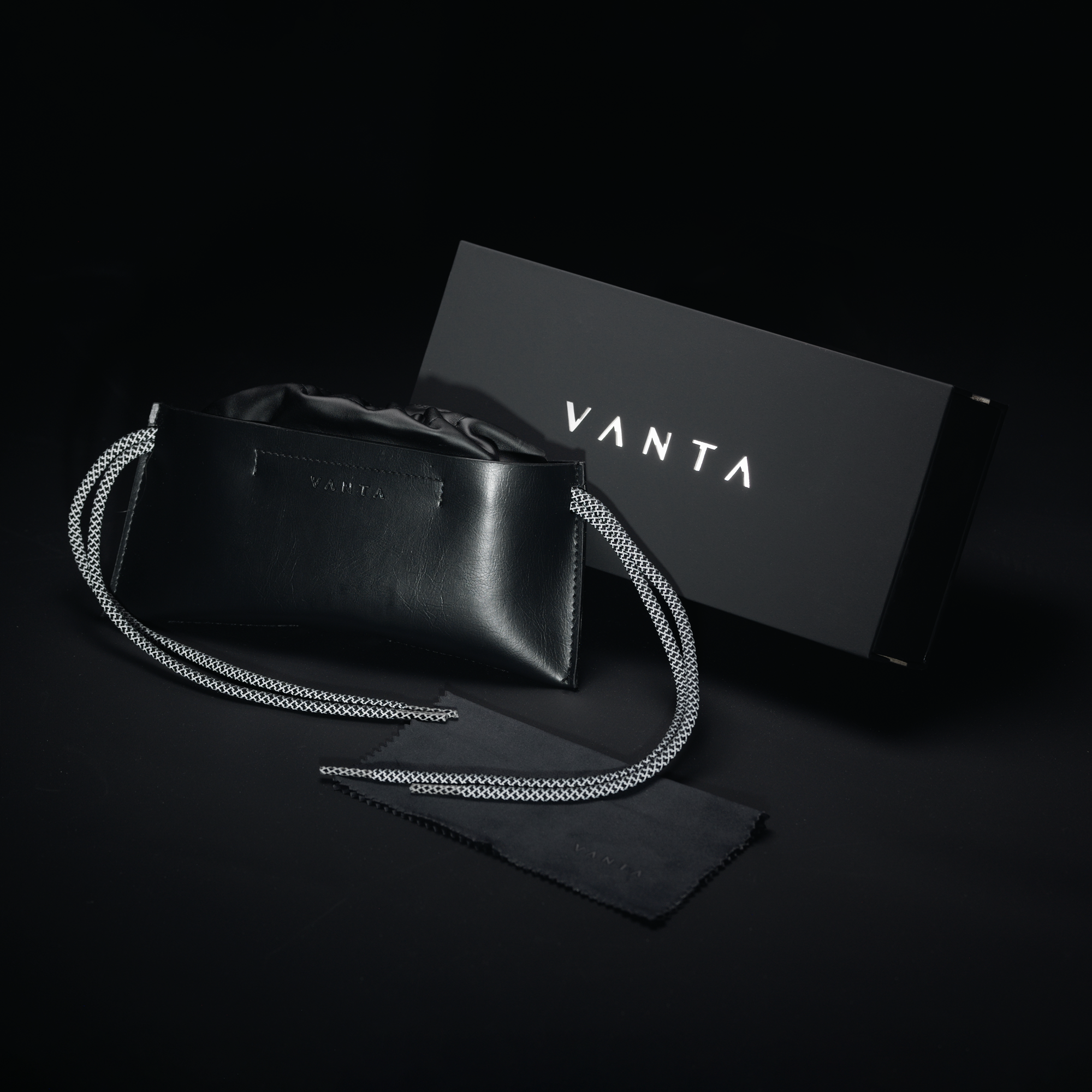 Elevating your unboxing experience, each meticulously crafted Vanta Corp frame arrives in a sleek matte black box, featuring an integrated LED light that activates upon opening. Inside, you'll find a luxurious faux leather case with an embossed Vanta Corp logo and reflective drawcords, designed for both style and protection. A premium microfiber cloth ensures your lenses remain flawless.
